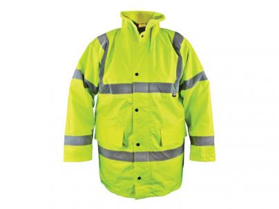 Scan High-Visibility Yellow Waterproof Motorway Jacket with 5cm Retro reflective taping on the arms and torso. The shell is made of 100% polyester 300D fabric, featuring 190 polyester taffeta lining. It has stitched and taped seams. The jacket has a quilted liner and polyester wadding to ensure excellent insulation and warmth. With a heavy-duty zip, foldaway hood, studded storm flap, elasticated cuffs and hem, this jacket is excellent at protecting from foul weather conditions.