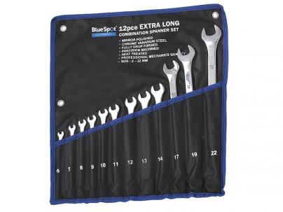 A 12 piece metric extra long combination spanner set chrome vanadium plated with hardened and tempered mirror polished steel heads. Arranged in size order in a handy storage wallet.