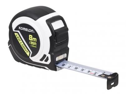 The Komelon LED LIGHT Tape Measure has an ultra-compact ABS case with a moulded rubber grip for increased comfort and more control in damp, wet or slippery conditions. It has an integral bright LED light, powered by a built-in, rechargeable, 2-hour Li-ion battery, which illuminates the non-reflective, white nylon-coated blade for accurate measurements in low light conditions.